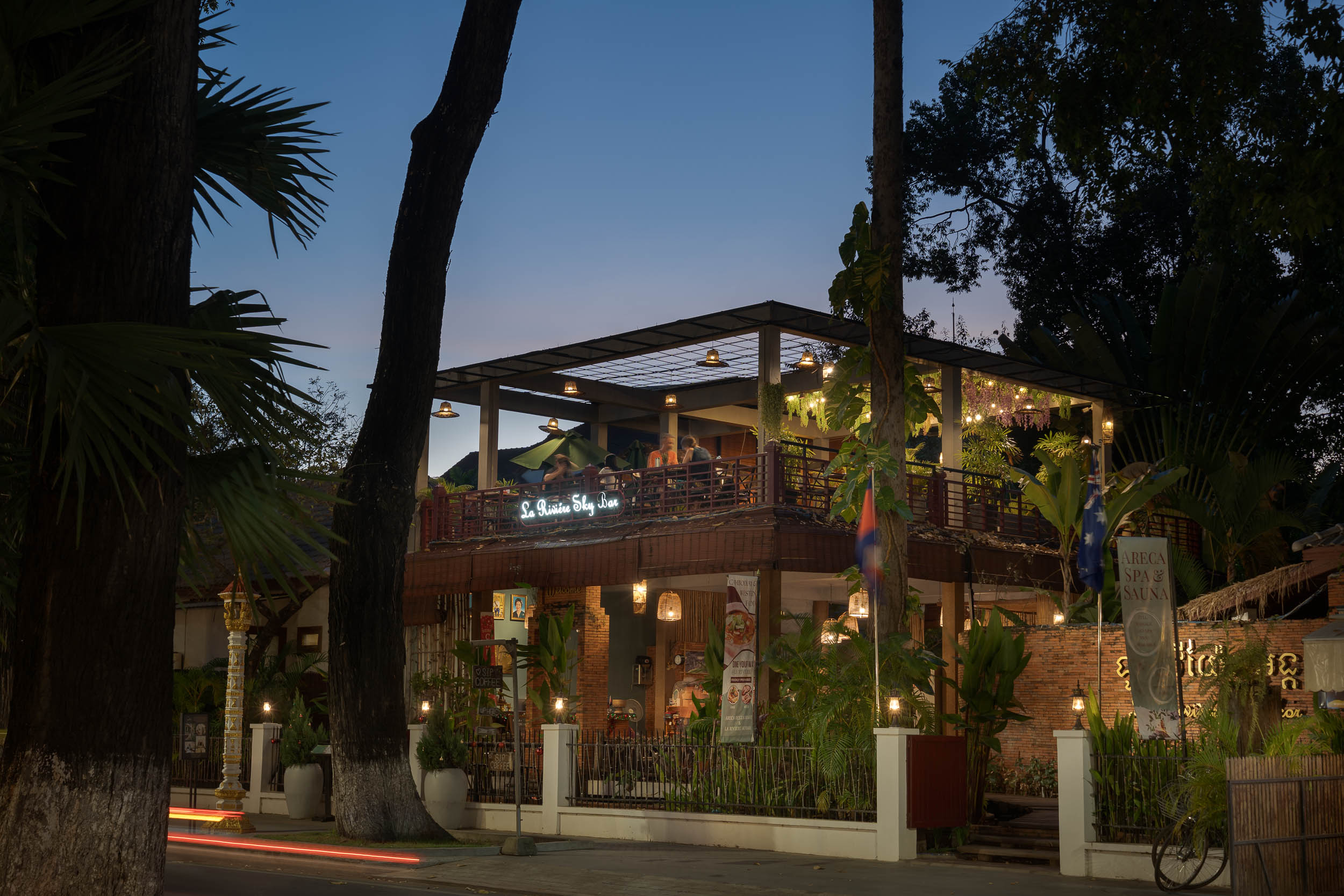 Above the river, the Areca Skybar offers an elevated setting for drinks and small bites in the heart of Siem Reap. Centrally positioned, it is the perfect place to begin your evening with sunset views over the river before exploring the town. Pub Street and the Siem Reap Night Markets are just a 10 minute walk away, making it easy to enjoy both relaxed riverside dining and the energy of the city in one evening.