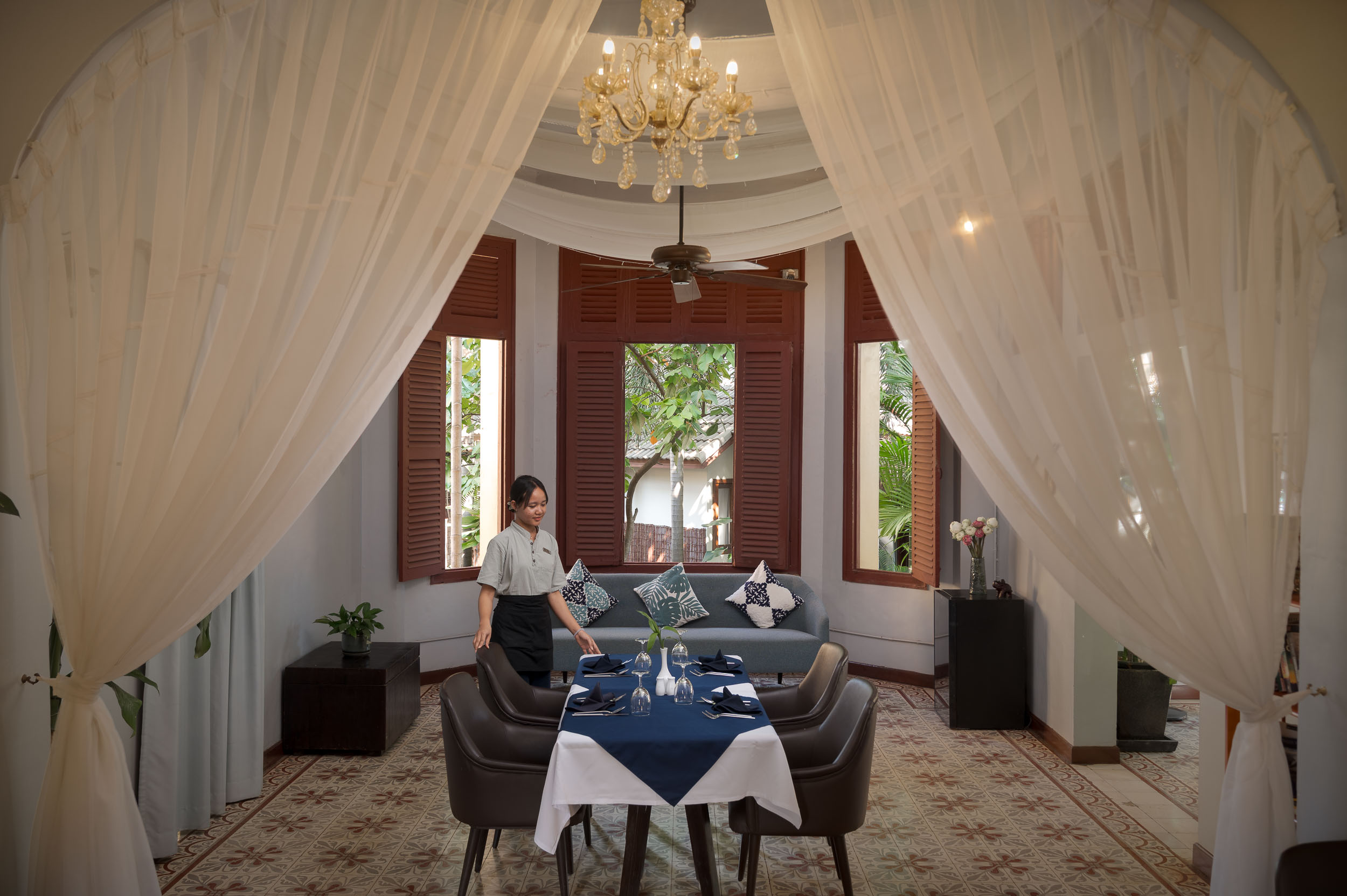 Areca Restaurant is set within our preserved French colonial building, surrounded by gardens and river views.