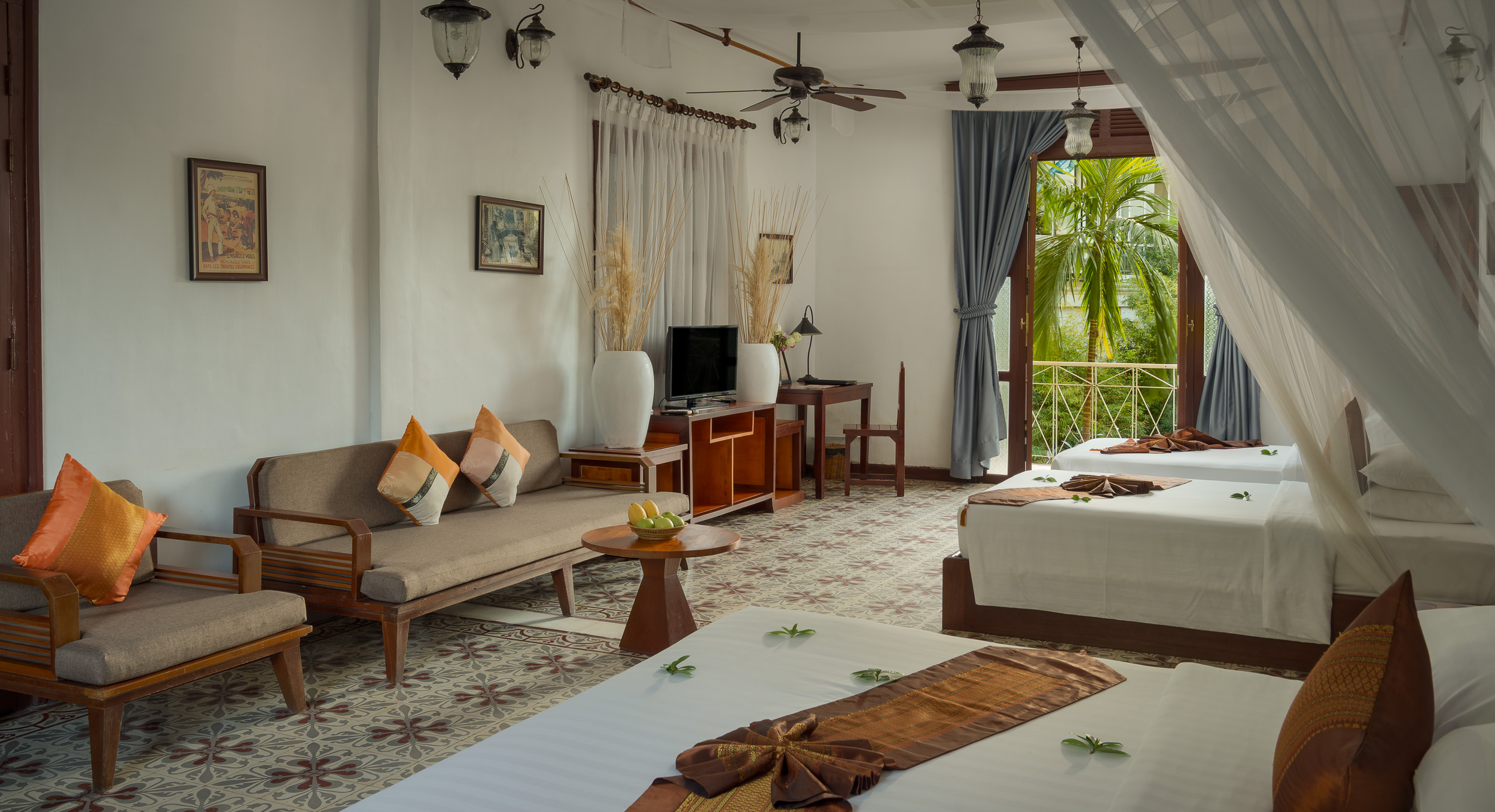 The Governor’s Suite is the most spacious and distinguished accommodation at La Riviere d’Angkor. Designed in a refined colonial style, the suite offers generous living space, garden and pool views, and a private balcony, creating a calm and private retreat for longer stays or special occasions.